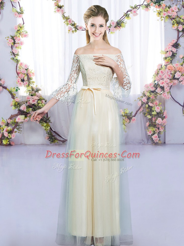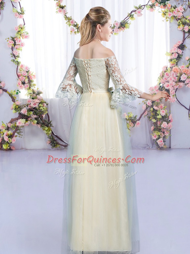 Cheap Champagne 3 4 Length Sleeve Floor Length Lace and Bowknot Lace Up Court Dresses for Sweet 16