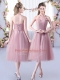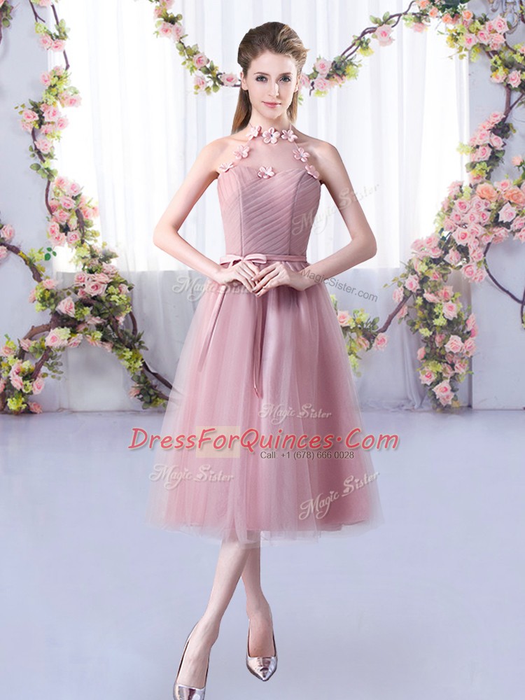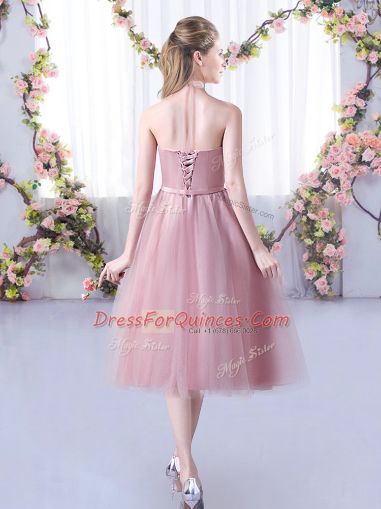 High Quality Tea Length Lace Up Quinceanera Court of Honor Dress Pink for Wedding Party with Appliques and Belt