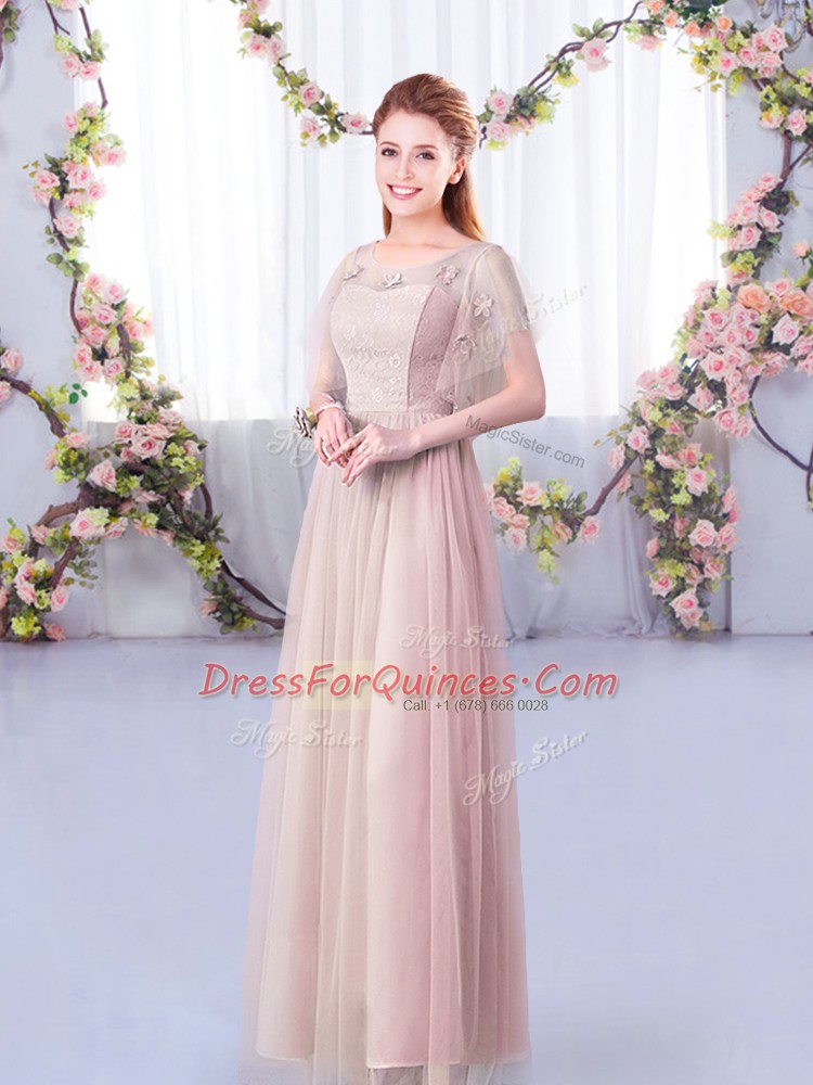 Pink Tulle Side Zipper Dama Dress for Quinceanera Short Sleeves Floor Length Lace and Belt