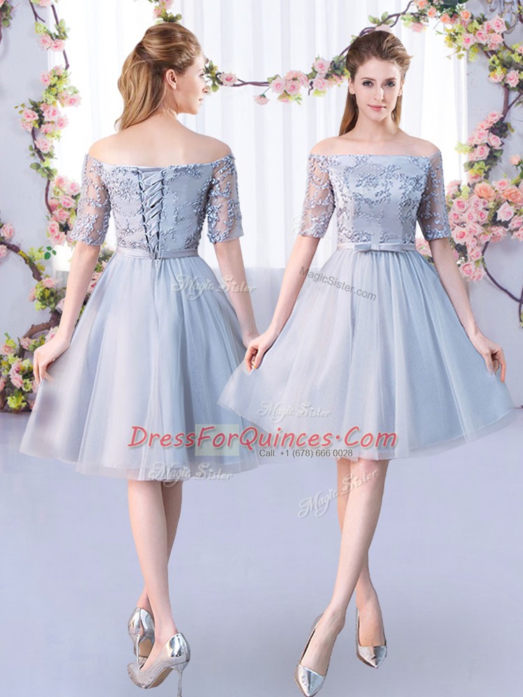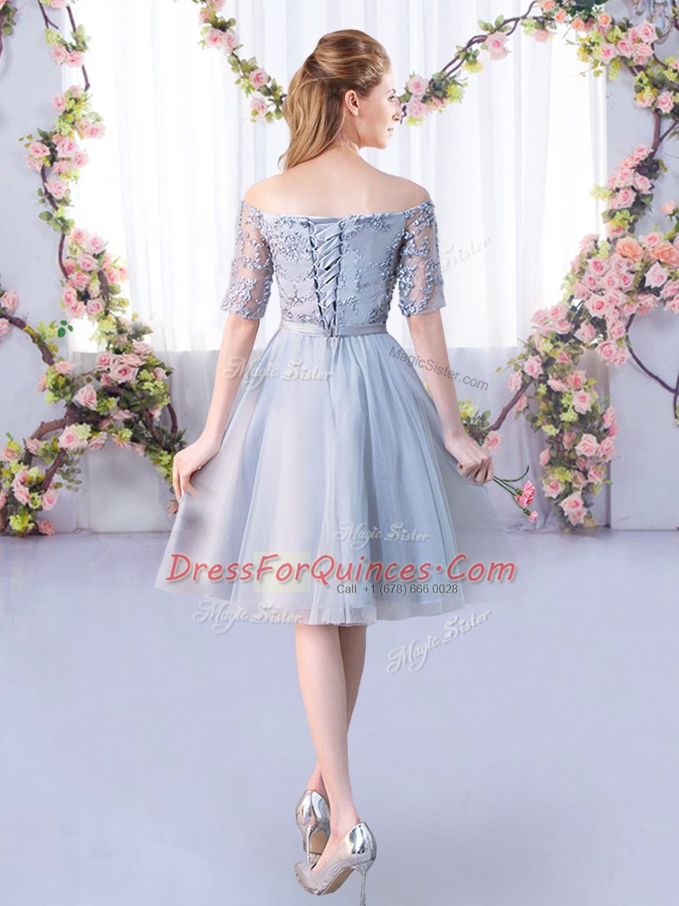 Popular Grey Tulle Lace Up Court Dresses for Sweet 16 Short Sleeves Knee Length Lace and Belt