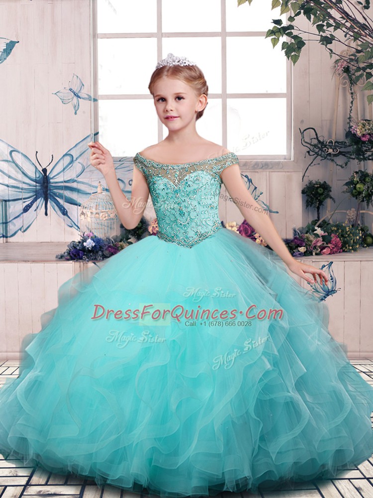 Amazing Tulle Off The Shoulder Sleeveless Lace Up Beading and Ruffles Little Girls Pageant Dress Wholesale in Aqua Blue