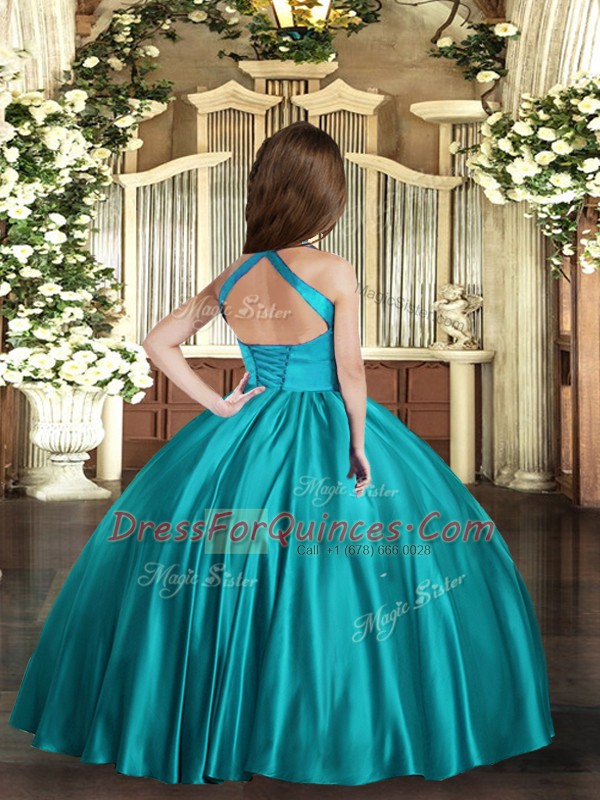 Customized Satin Straps Sleeveless Lace Up Ruching Little Girl Pageant Dress in Teal