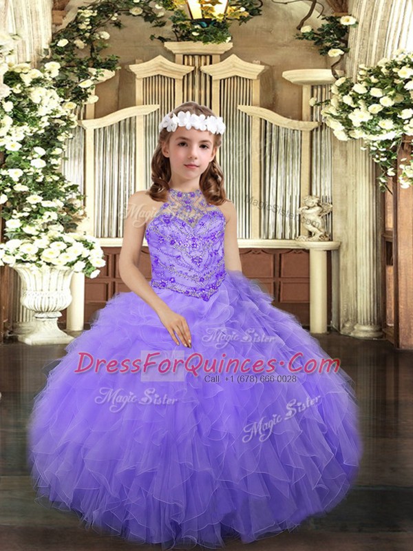 Eye-catching Lavender Ball Gowns Tulle Halter Top Sleeveless Beading and Ruffles Floor Length Lace Up Pageant Gowns For Girls