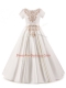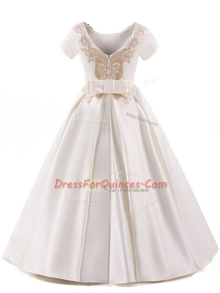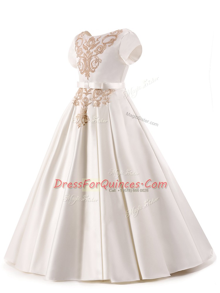 Latest White Satin Zipper Scoop Short Sleeves Floor Length Little Girls Pageant Dress Wholesale Appliques