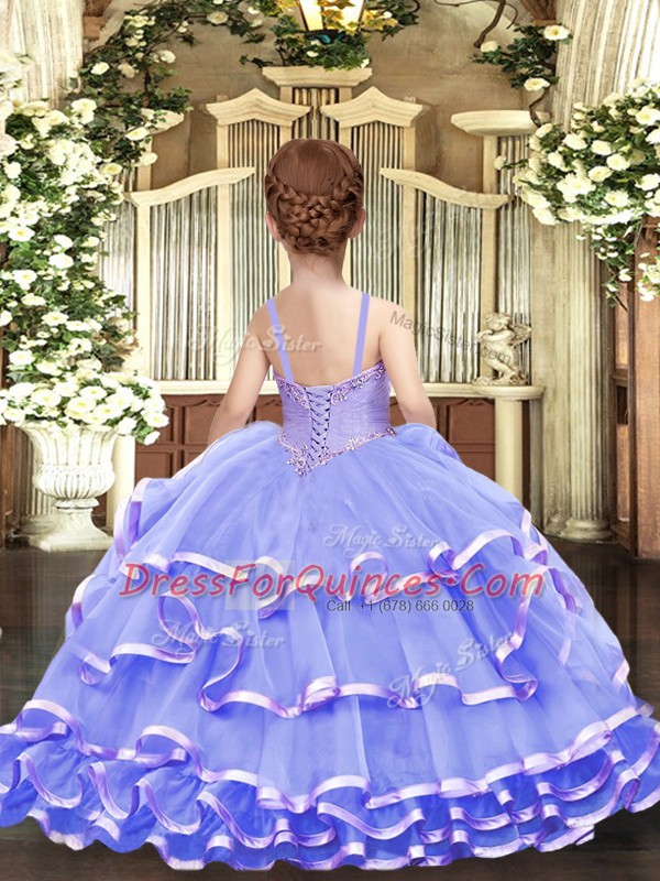 Lilac Ball Gowns Beading and Ruffled Layers Little Girl Pageant Gowns Lace Up Organza Sleeveless Floor Length