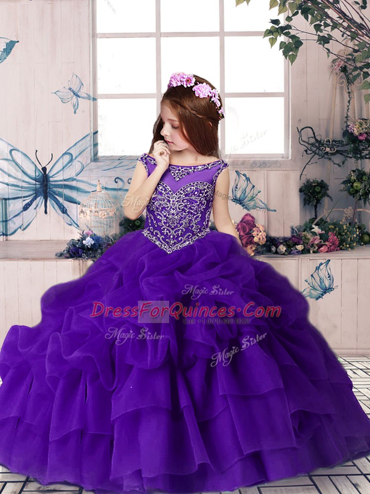 On Sale Column/Sheath Kids Formal Wear Purple Scoop Organza Sleeveless Floor Length Zipper