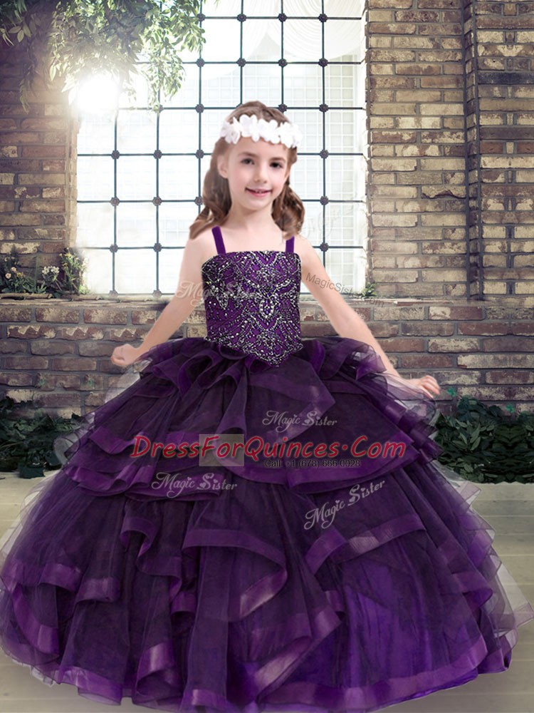 Purple Lace Up Straps Beading and Ruffles Little Girls Pageant Dress Wholesale Tulle Sleeveless