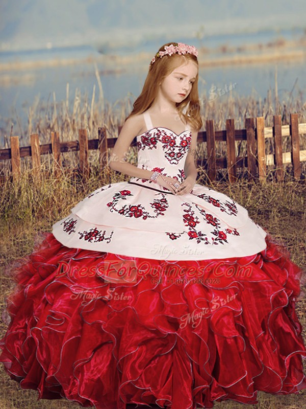 Red Little Girls Pageant Gowns Party and Sweet 16 and Wedding Party with Embroidery and Ruffles Straps Sleeveless Lace Up