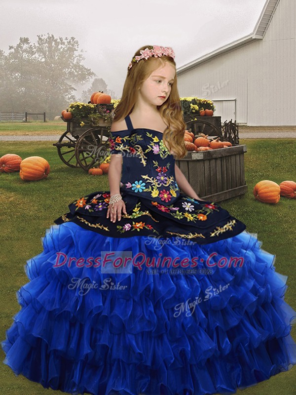 Royal Blue Sleeveless Floor Length Embroidery Lace Up Little Girls Pageant Dress