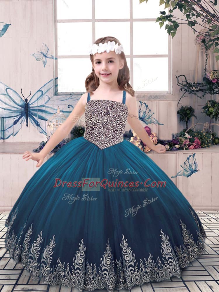 Stylish Tulle Straps Sleeveless Lace Up Beading and Embroidery Girls Pageant Dresses in Teal