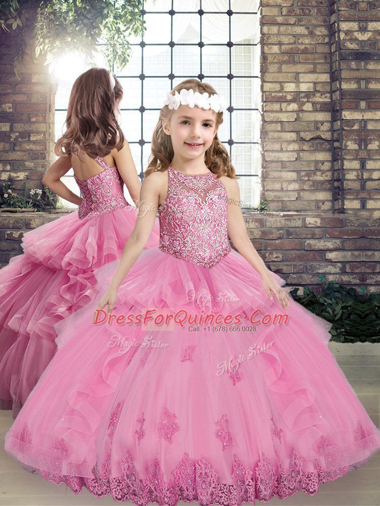 Trendy Tulle Sleeveless Floor Length Child Pageant Dress and Beading and Appliques