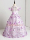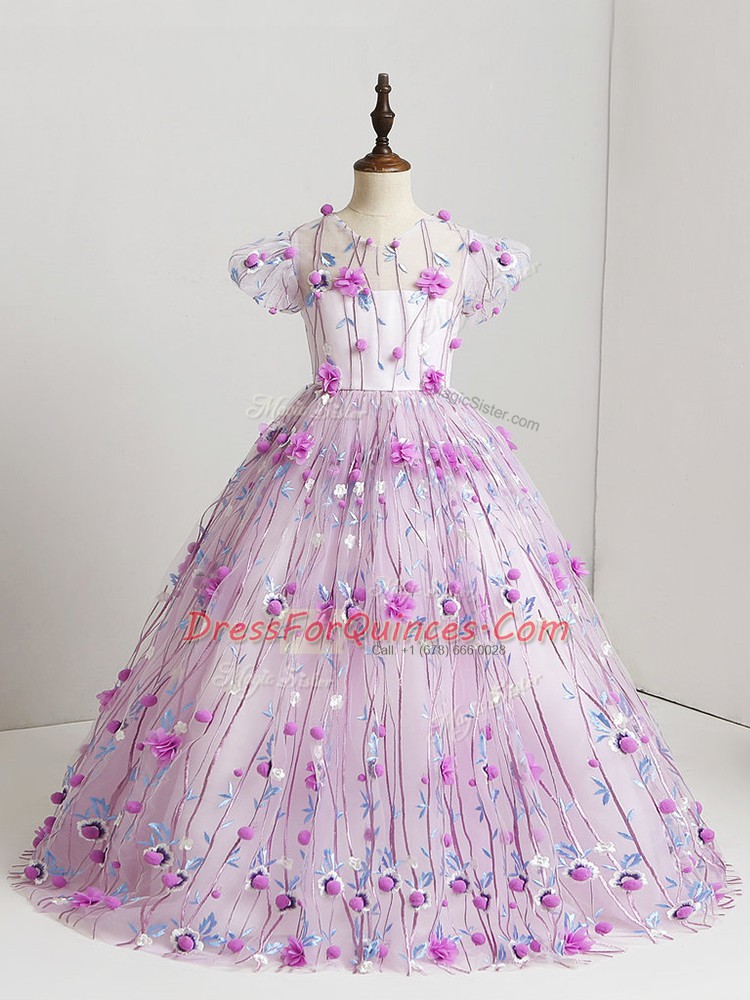 V-neck Short Sleeves Little Girl Pageant Dress Floor Length Hand Made Flower Lilac Tulle
