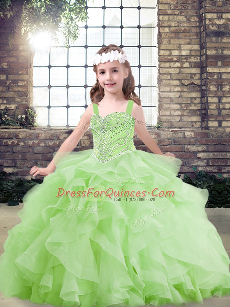 Yellow Green Lace Up Straps Beading and Ruffles Kids Formal Wear Tulle Sleeveless