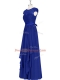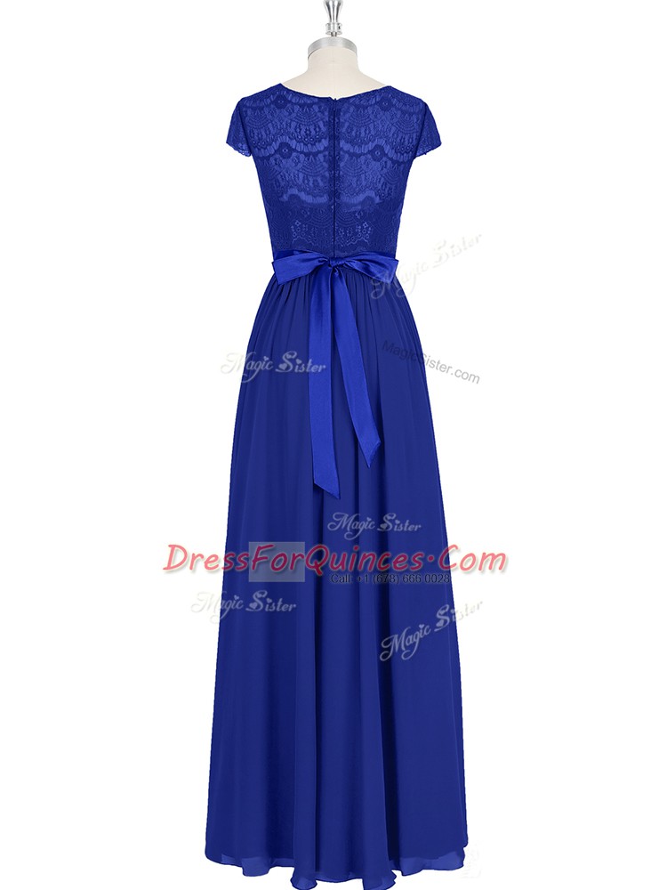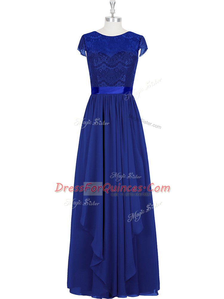 Chic A-line Prom Evening Gown Royal Blue Scoop Chiffon Cap Sleeves Floor Length Zipper