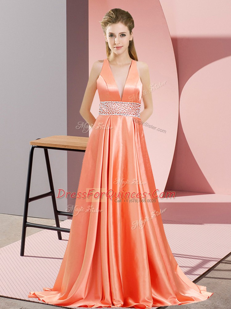Custom Design V-neck Sleeveless Brush Train Backless Prom Gown Orange Red Elastic Woven Satin