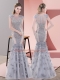 Custom Fit Beading and Lace and Hand Made Flower Prom Gown Grey Lace Up Cap Sleeves Floor Length