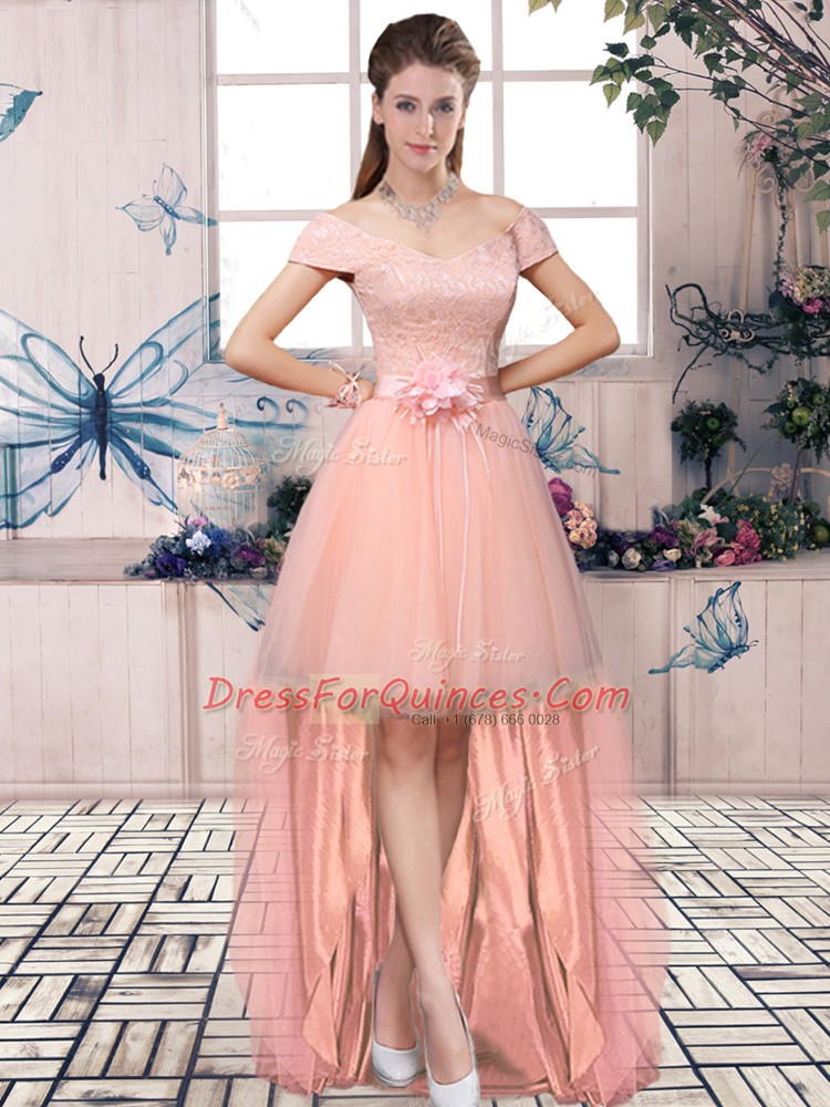 Designer High Low Lace Up Evening Dress Pink for Prom and Party with Lace and Hand Made Flower
