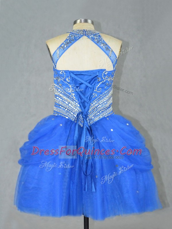 Extravagant Mini Length Lace Up Prom Evening Gown Blue for Prom and Party with Beading