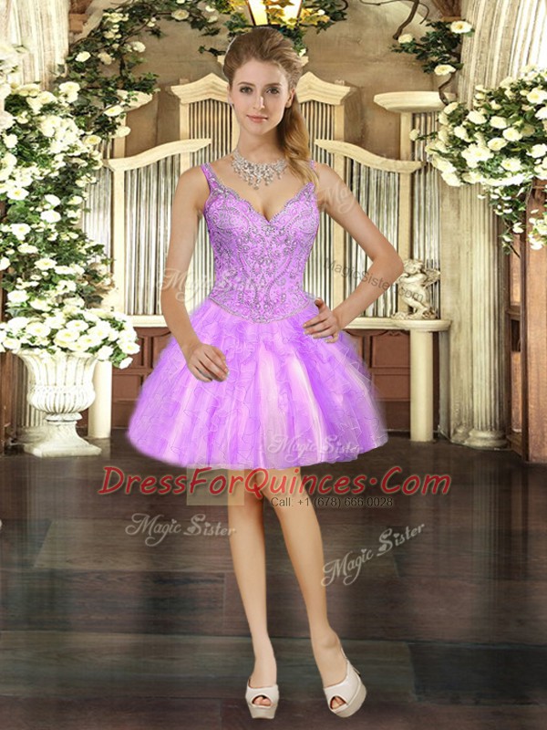 Lilac Ball Gowns Tulle V-neck Sleeveless Beading and Ruffles Mini Length Lace Up Prom Dresses