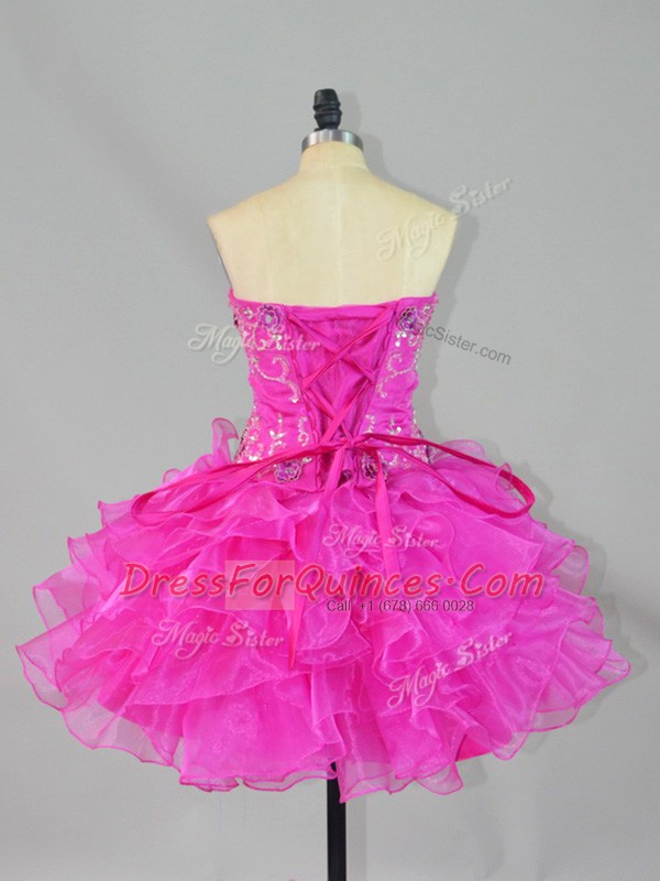 Luxury Mini Length Fuchsia Prom Party Dress Organza Sleeveless Beading and Ruffles