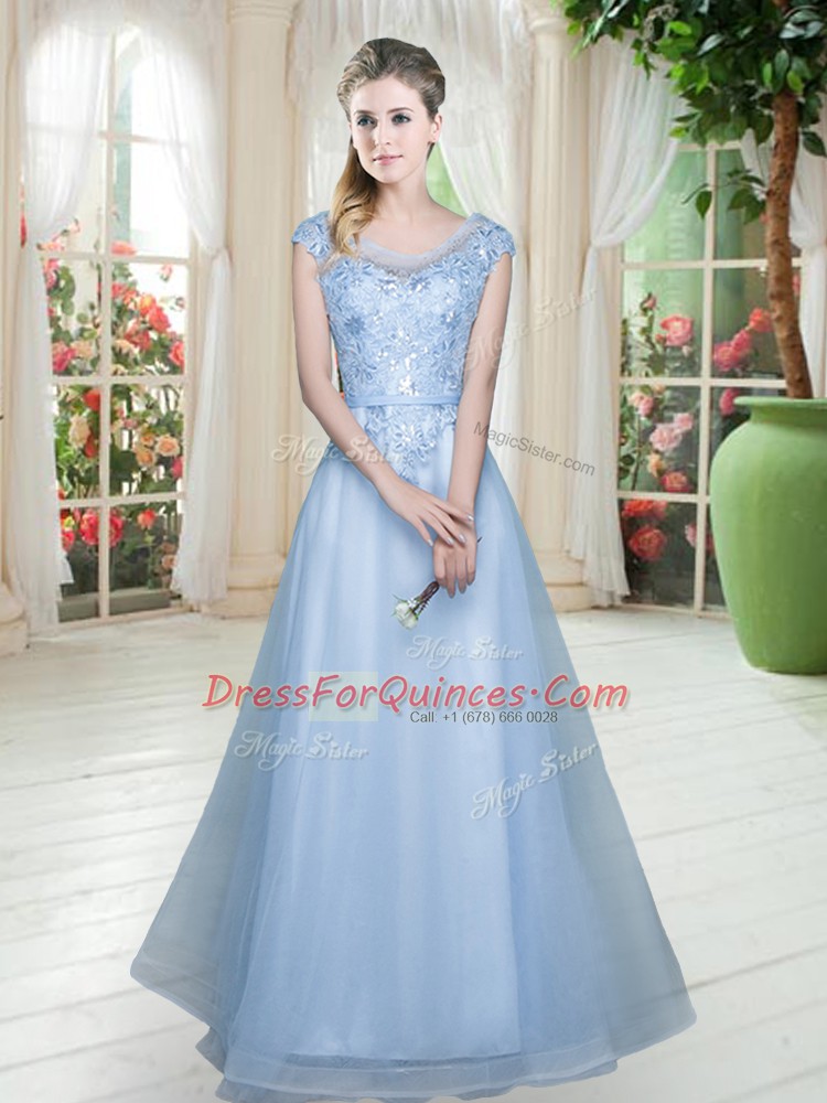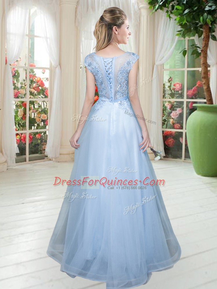 Simple Light Blue Evening Dress Prom and Party with Lace Scoop Cap Sleeves Lace Up