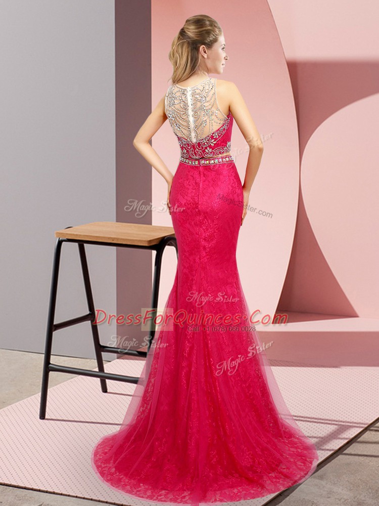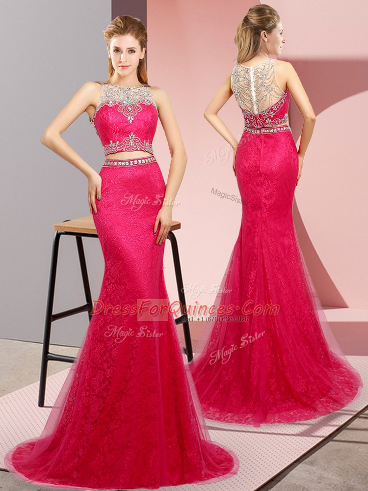 Sweep Train Two Pieces Hot Pink Scoop Tulle and Lace Sleeveless Lace Up