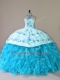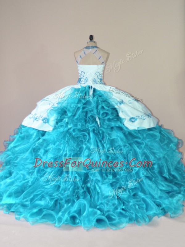Aqua Blue Halter Top Lace Up Embroidery and Ruffles Quinceanera Dresses Court Train Sleeveless