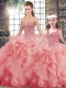 Artistic Watermelon Red Tulle Lace Up Vestidos de Quinceanera Sleeveless Brush Train Beading and Ruffles