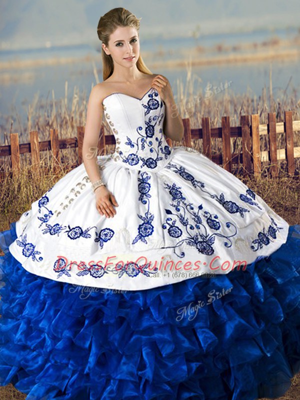 Blue And White Lace Up 15 Quinceanera Dress Embroidery and Ruffles Sleeveless Floor Length