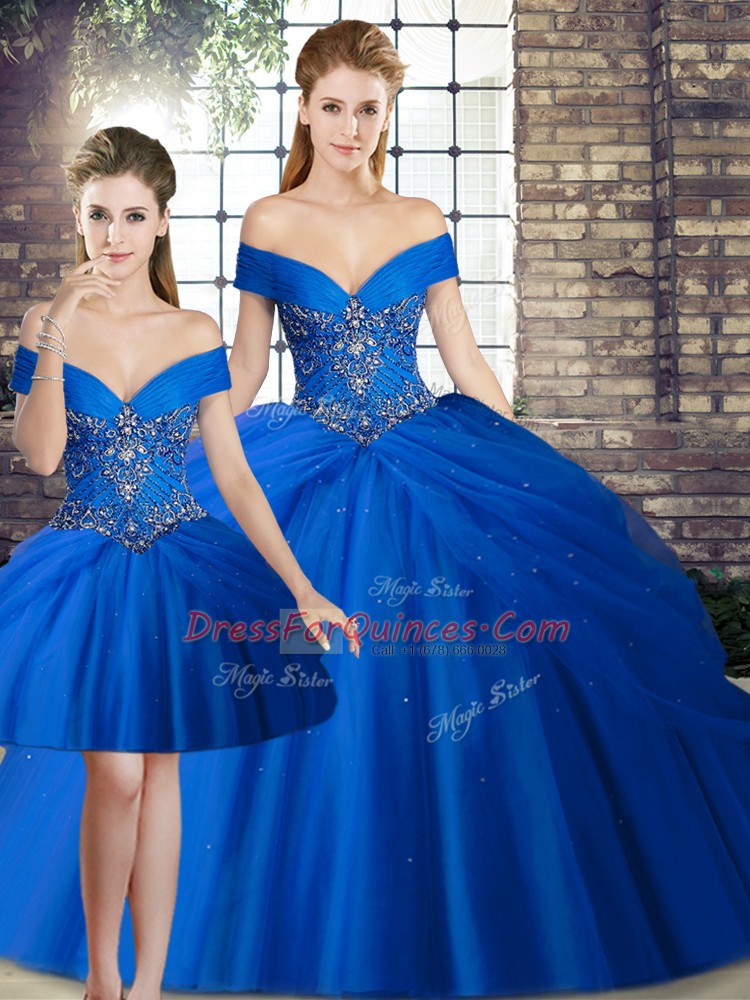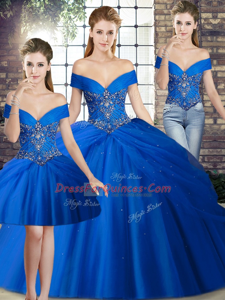 Dazzling Brush Train Three Pieces 15 Quinceanera Dress Royal Blue Off The Shoulder Tulle Sleeveless Lace Up