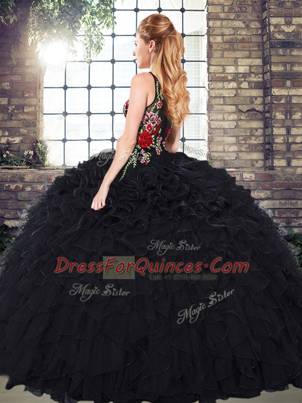 Elegant Floor Length Black Sweet 16 Quinceanera Dress Organza Sleeveless Embroidery and Ruffles
