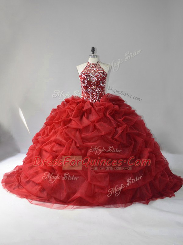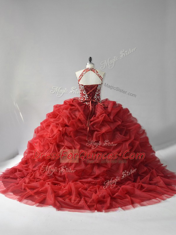 Enchanting Sleeveless Beading and Pick Ups Lace Up Ball Gown Prom Dress with Wine Red Court Train