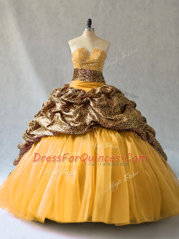 Gold Ball Gowns Beading and Pick Ups Quinceanera Gown Lace Up Organza Sleeveless