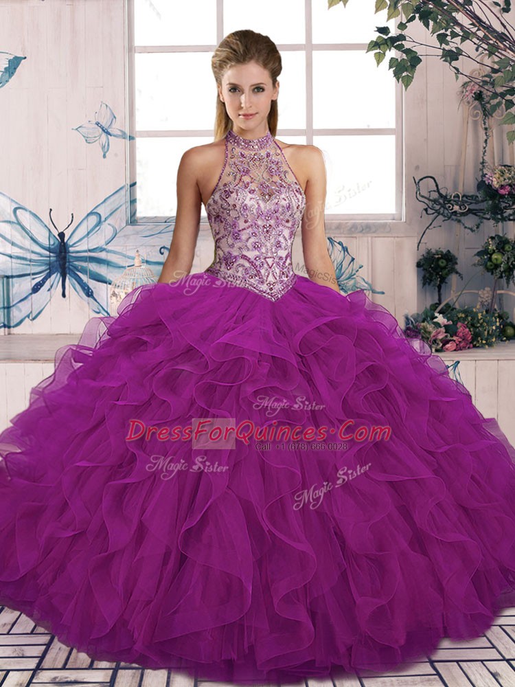 Halter Top Sleeveless Quince Ball Gowns Floor Length Beading and Ruffles Purple Tulle