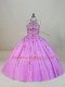 Modest Tulle Halter Top Sleeveless Brush Train Lace Up Appliques and Embroidery Quinceanera Dress in Lilac