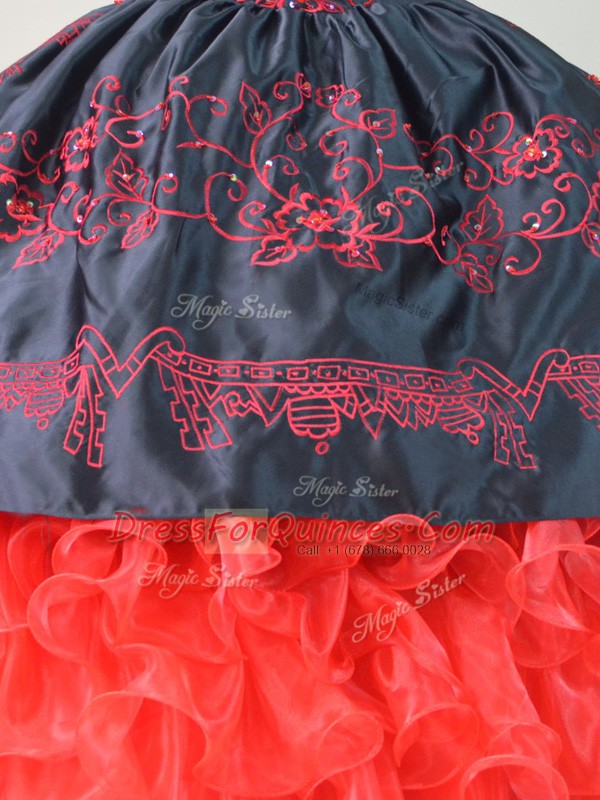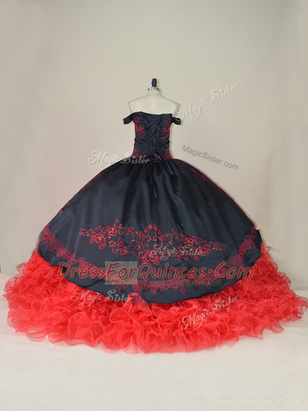 Off The Shoulder Sleeveless Brush Train Lace Up Sweet 16 Dresses Red And Black Satin and Organza