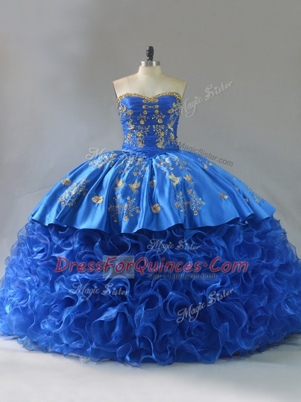 Popular Royal Blue Fabric With Rolling Flowers Lace Up Quinceanera Gowns Sleeveless Embroidery and Ruffles