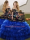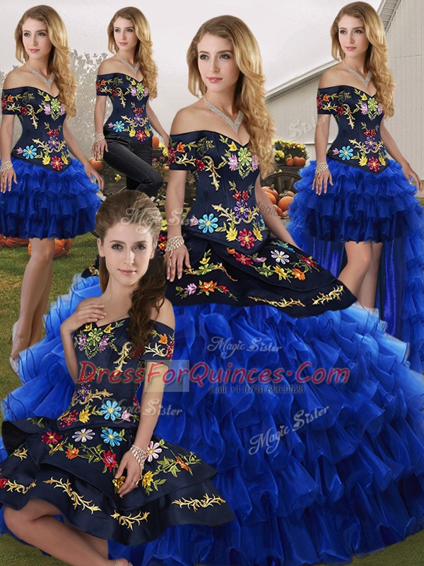 Vintage Blue And Black Lace Up Off The Shoulder Embroidery and Ruffled Layers Quince Ball Gowns Organza Sleeveless