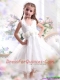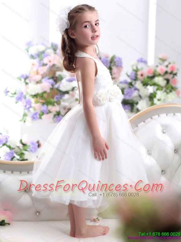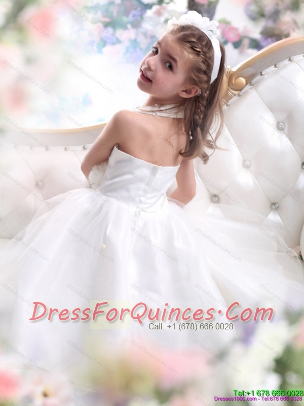 Adorable Halter Top White Mini Length Little Girl Pageant Dress with Hand Made Flower