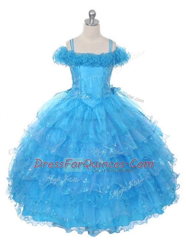 Ball Gowns Little Girls Pageant Dress Wholesale Baby Blue Off The Shoulder Organza Sleeveless Floor Length Lace Up