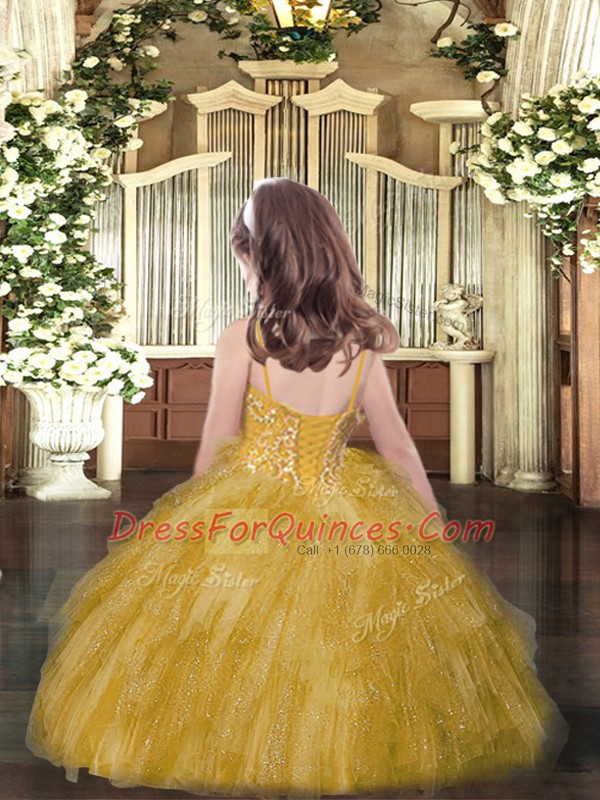 Best Orange Red Spaghetti Straps Neckline Beading and Ruffles Little Girl Pageant Dress Sleeveless Lace Up