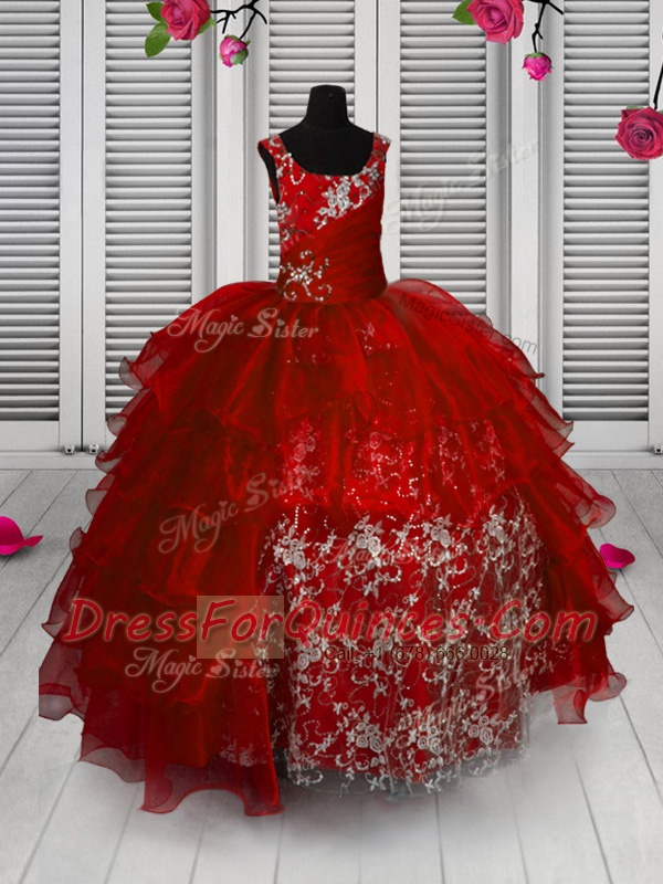 Dynamic Red Organza Lace Up Little Girls Pageant Dress Sleeveless Floor Length Appliques and Ruffled Layers