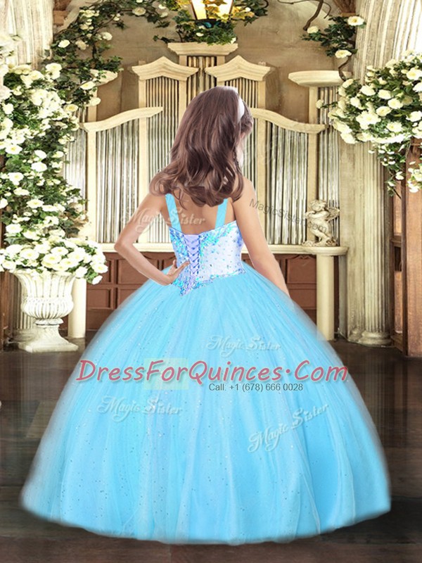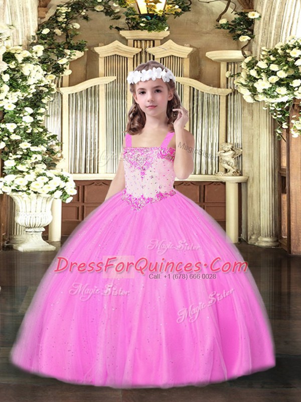 Elegant Straps Sleeveless Lace Up Little Girl Pageant Dress Rose Pink Tulle
