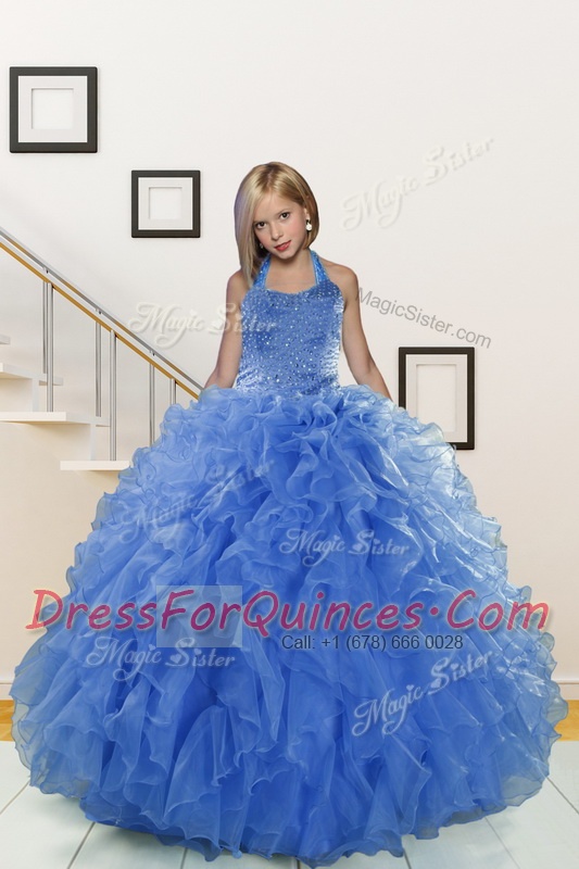 Exceptional Halter Top Beading and Ruffles Little Girls Pageant Dress Blue Lace Up Sleeveless Floor Length