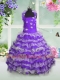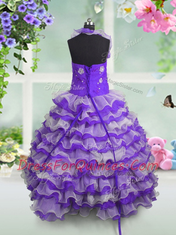 Eye-catching Lavender Ball Gowns Straps Sleeveless Organza Floor Length Lace Up Beading and Appliques and Ruffled Layers Little Girl Pageant Dress