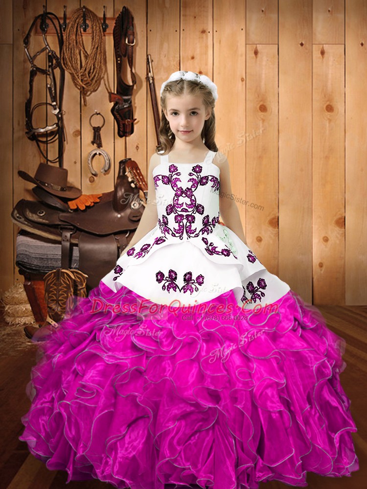 Fuchsia Organza Lace Up Straps Sleeveless Floor Length Little Girl Pageant Gowns Embroidery and Ruffles