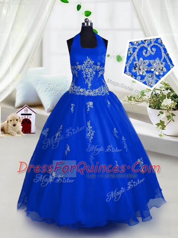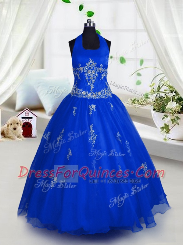 Halter Top Floor Length A-line Sleeveless Blue Little Girl Pageant Dress Lace Up