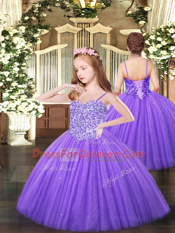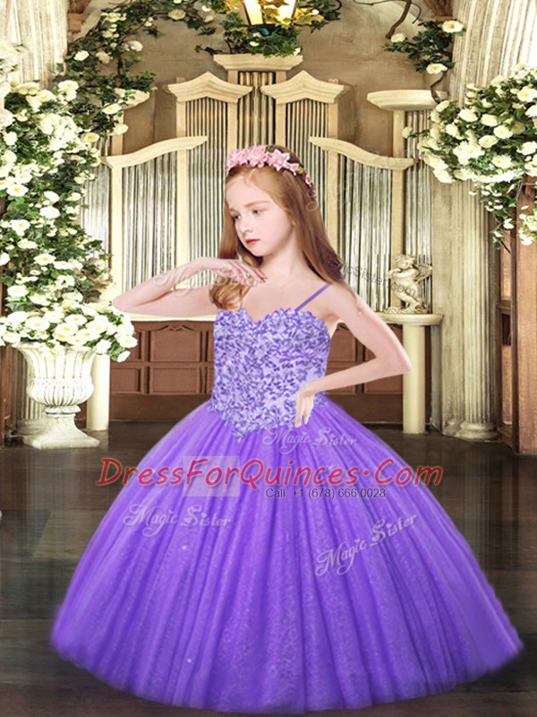 Lavender Little Girls Pageant Dress Party and Quinceanera with Appliques Spaghetti Straps Sleeveless Lace Up