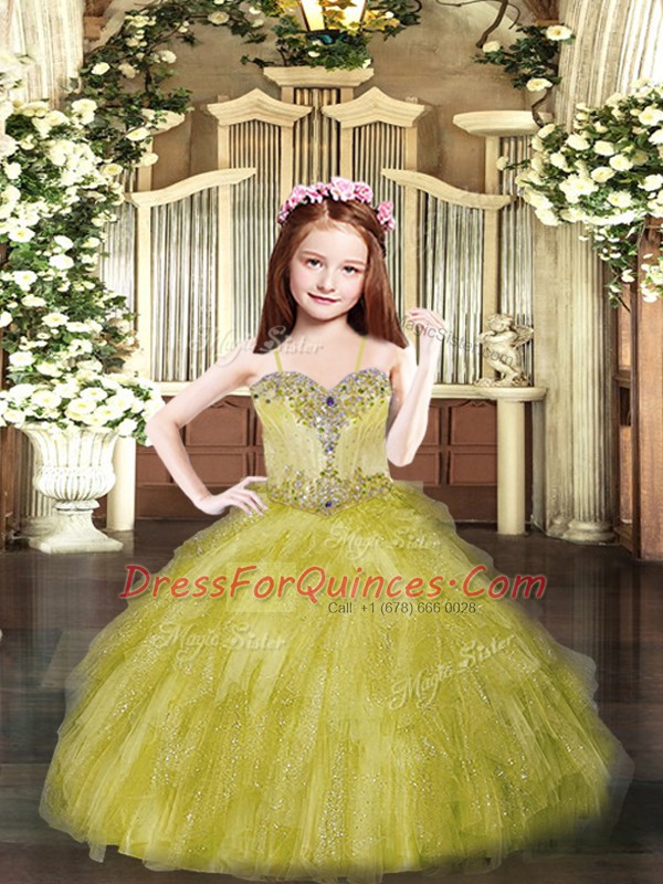Olive Green Tulle Lace Up Little Girls Pageant Gowns Sleeveless Floor Length Beading and Ruffles