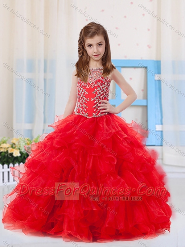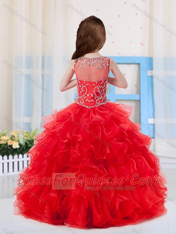 Red Ball Gowns Scoop Organza Beaded Bodice Little Girl Pageant Dress with Side Zipper